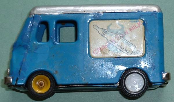 MSK Cragston's Milk Truck. Marks inside diamond shape next to milk bottle on each side are as follows: "MSK"-Miyazawa Model Co. Ltd., Japan, and "TS" is for Taniguchi, Japan, circa 1950's. It measures 4 7/8" long. Friction drive works. No back door . In some areas it has been partially repainted on the blue area and most of the silver roof has also been repainted. A plastic wheel from another toy has been attached to the rear left side where the original wheel was lost. A dent at the front left side has caused an angle on the front left headlight. Some general wear, but Cragston logos are intact. A really nice, hard-to-find, truck. Pick up or shipping only, buyer pays shipping. Cash preferred.